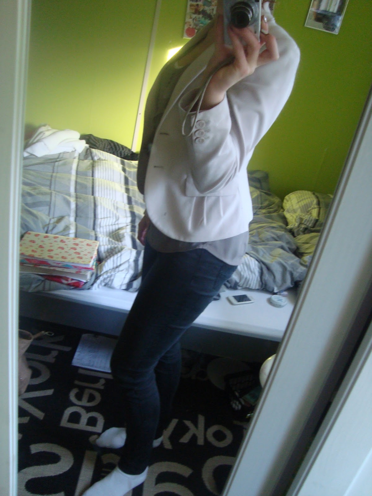- ik heb dit mooie roomkleurige colbert aan. hij is heel mooi gemaakt met van die mooie vouwtjes erin aan de onderkant en hij laat je vrouwelijke rondingen heel mooi uitkomen. ook deze komt bij de H&M vandaan.